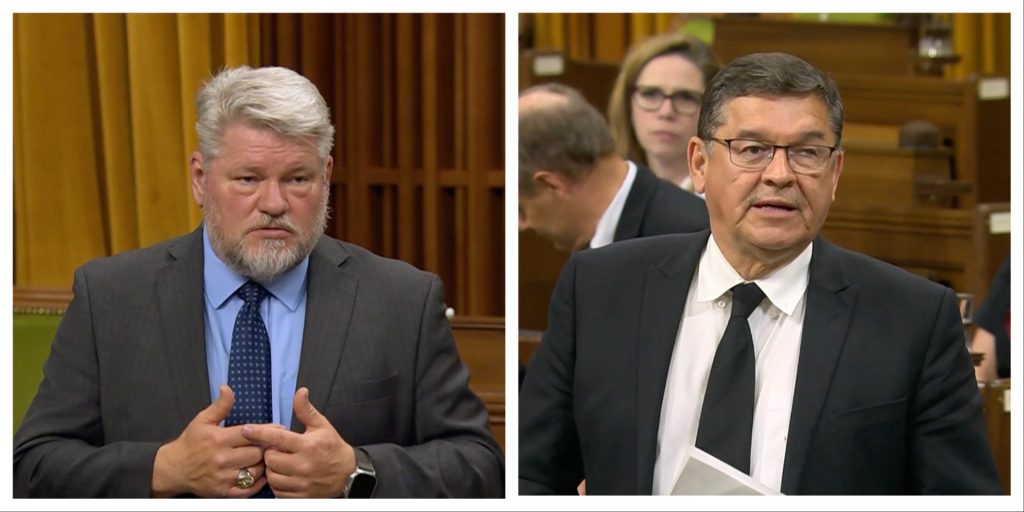 During the June 3 emergency debate on the Prairie wildfires, Conservative MP Randy Hoback, left, offered to share his Prince Albert, Sask., constituency office with Secretary of State for Rural Development Buckley Belanger, whose riding has been affected by the ongoing fires. Screenshots courtesy of CPAC