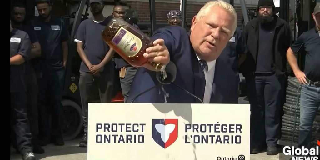 Ontario Premier Doug Ford pours Crown Royal Canadian whisky on the ground in protest of Diageo's plans to shut down its local Crown Royal bottling plant in Amherstburg, Ont., and move jobs south of the border on Sept. 2, 2025. Screen shot courtesy of Global News