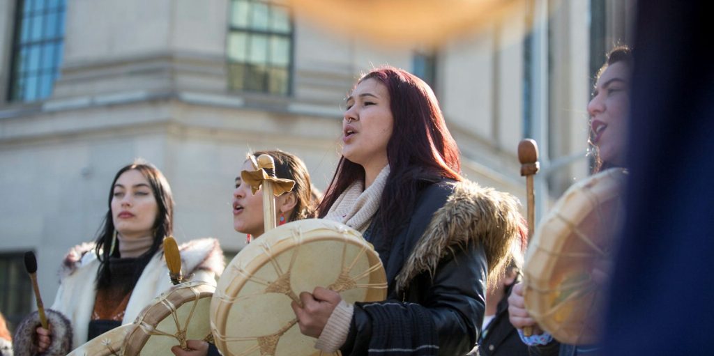 Demonstrators supporting the Wetʼsuwetʼen nation in British Columbia against the building of the Coastal Gasoline pipeline through their traditional territory protest in downtown Ottawa on Feb. 24, 2020. The Hill Times photograph by Andrew Meade