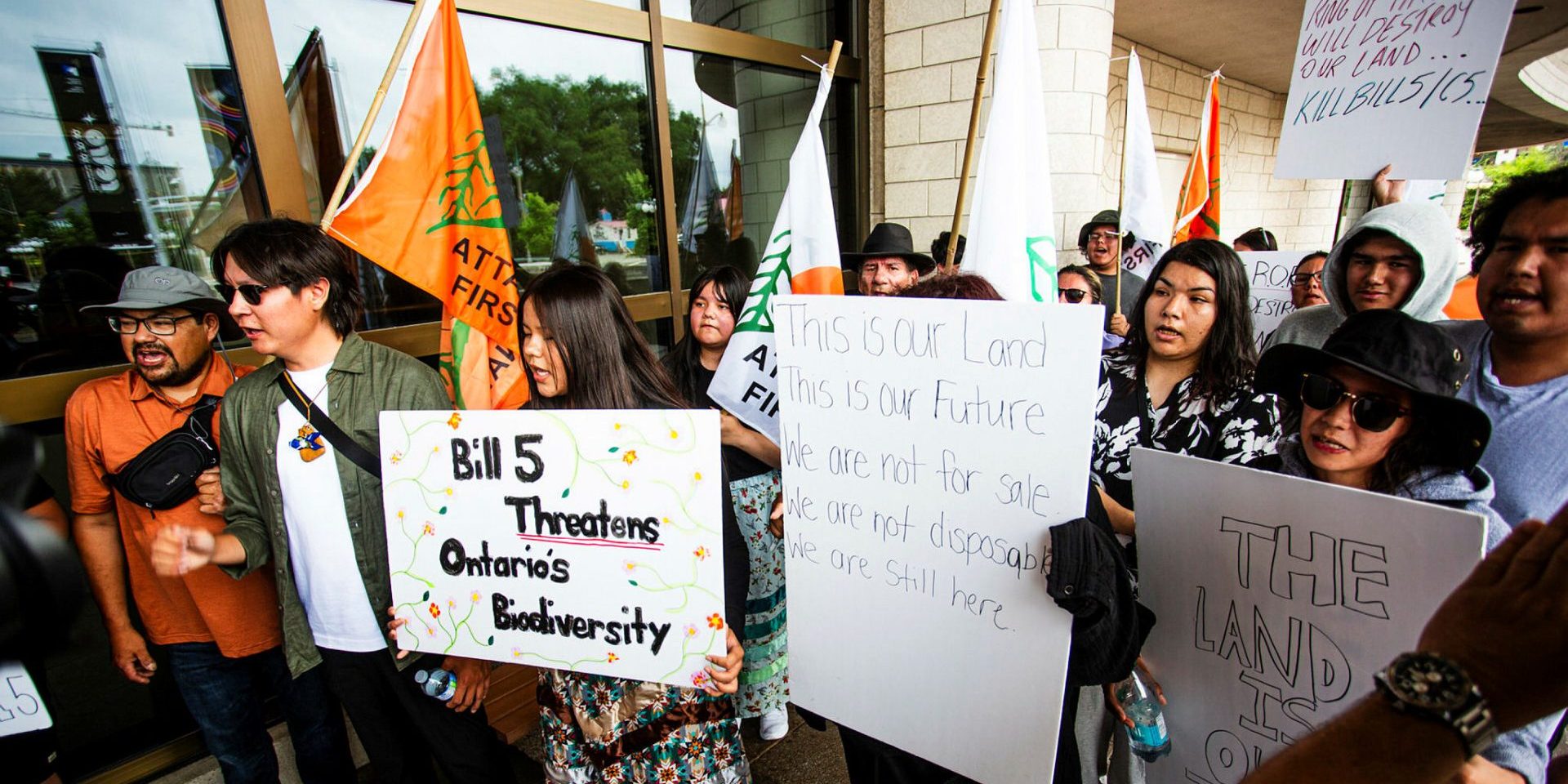 A group of First Nations youth gather outside the Prime Minister’s First Nations summit on Bill C-5 in Gatineau, Que. on July 17, 2025, calling on the government to respect treaty rights and oppose Bill C-5. The Hill Times photograph by Andrew Meade