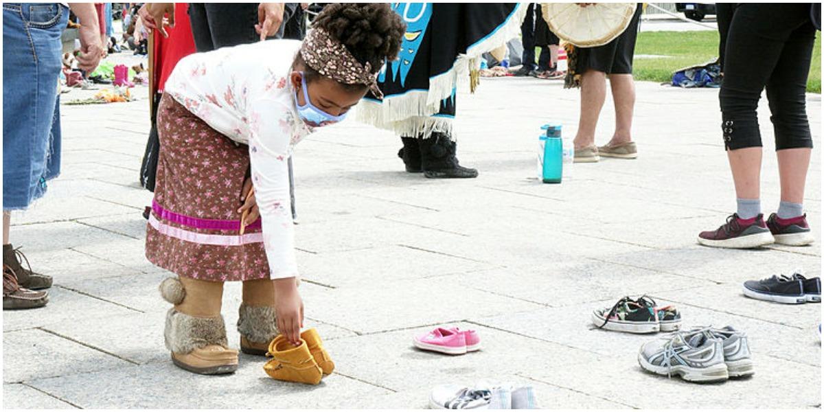 A child places moccasins among dozens of shoes on the steps of Parliament Hill at a June 3, 2021, event to honour the 215 children whose remains were found on the grounds of the Kamloops Indian Residential School.  The Hill Times photograph by Sam Garcia