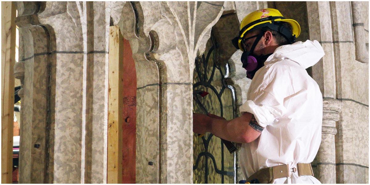 During a press tour of Centre Block on June 16, 2021, a worker removes a stained glass window. The Hill Times photograph by Sam Garcia