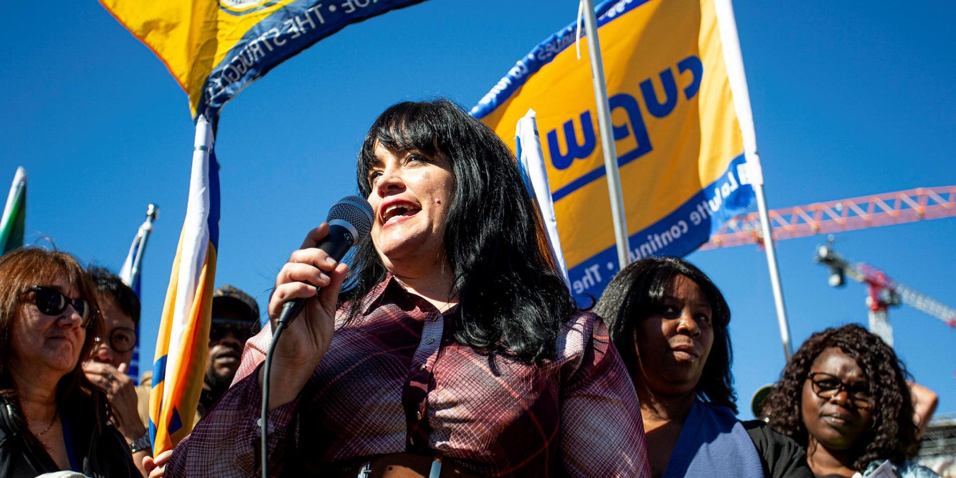 Bloc Québécois MP Marilène Gill speaks to Canadian Union of Postal Workers members protesting the government’s recently announced cuts to the postal service at a rally on Parliament Hill on Oct. 1, 2025. The Hill Times photograph by Andrew Meade
