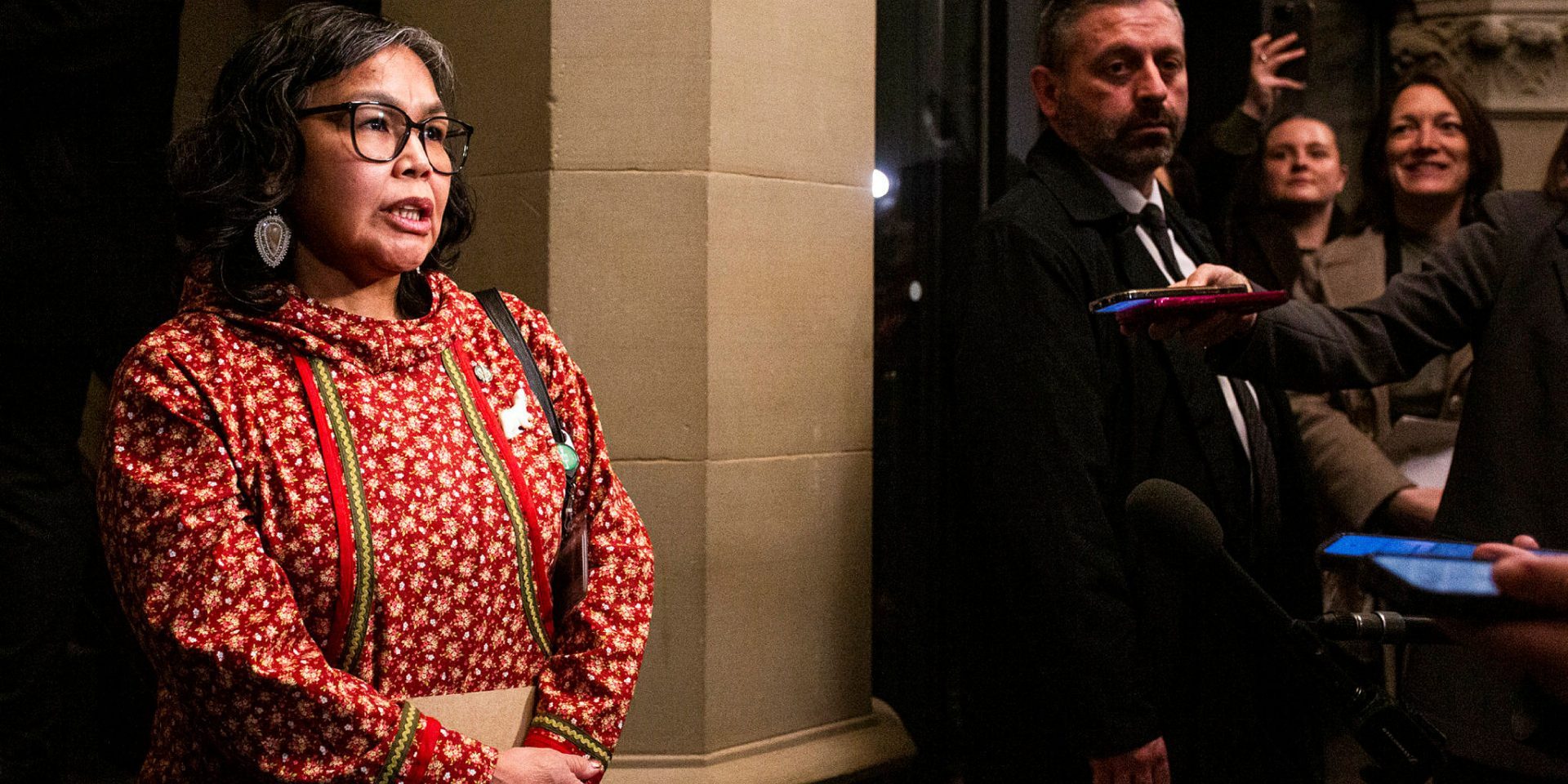 New Liberal caucus addition Lori Idlout, left, speaks with reporters before the Liberal party caucus meeting in West Block on March 11, 2026. 'I'm very thankful to be so warmly welcomed.' The Hill Times photograph by Andrew Meade