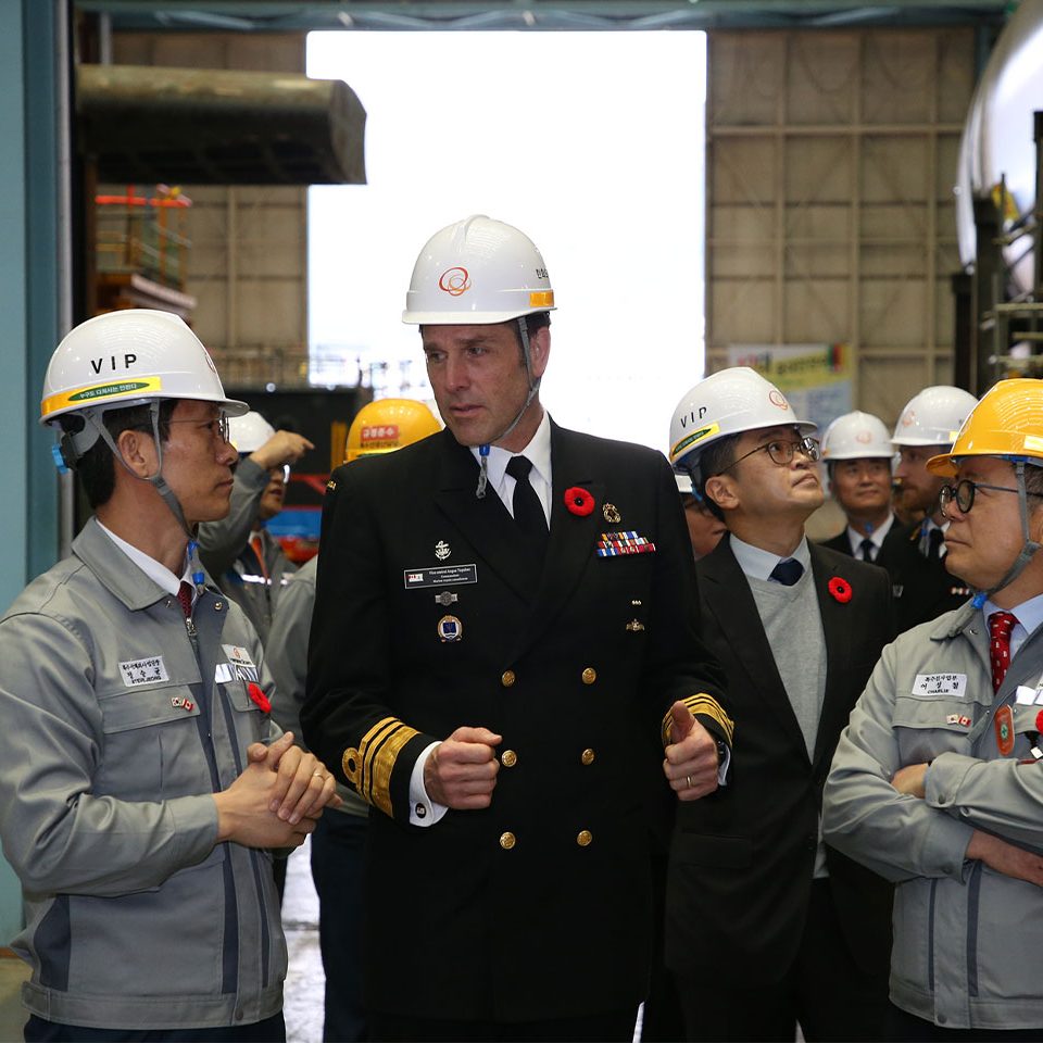 Royal Navy Commander Vice-Admiral Angus Topshee, centre left, views a model of Hanwha Ocean's KSS-III class submarines during a visit to the Okpo Shipyard in South Korea in November 2024. Photograph courtesy of Hanwha Ocean