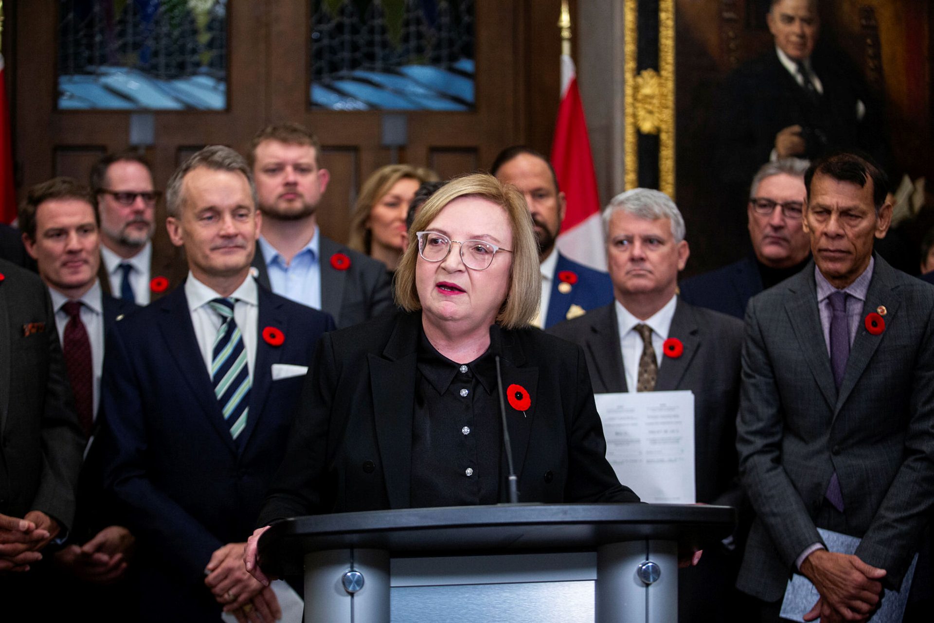 Parliamentarians attend the noon flag raising in honour of residential school Survivors’ Flag on Parliament Hill on Oct. 1. The Hill Times photograph by Andrew Meade