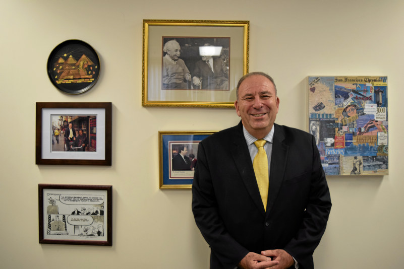 Israeli Ambassador Nimrod Barkan stands in front of photos and personal collections from his career in the foreign service in his Ottawa office. The Hill Times photograph by Chelsea Nash