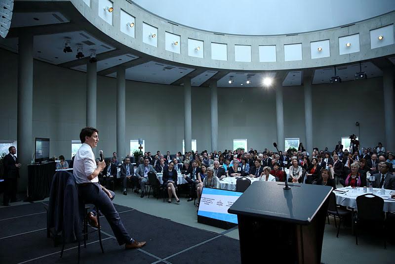 Prime Minister Justin Trudeau addresses a room full of Canadian heads of mission, in Ottawa for the first such conference in at least 30 years. Photograph courtesy of Adam Scotti