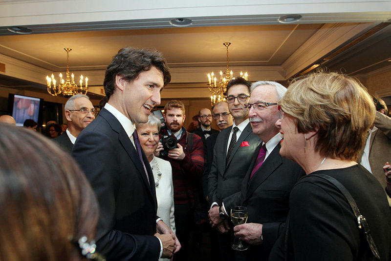 Justin Trudeau speaks to former protocol chief Robert Collette, second from right, and foreign diplomats at a reception marking the European Union's 40th anniversary of diplomatic presence in Canada on Feb 18. The Hill Times photograph by Sam Garcia