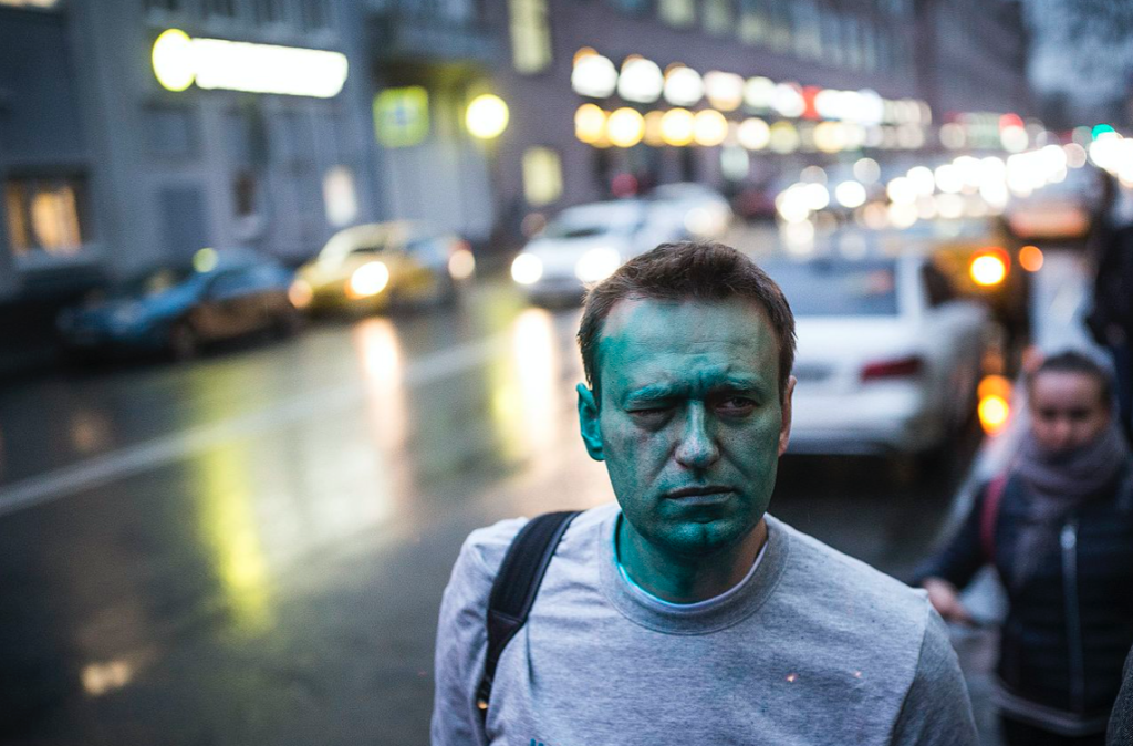 Russian opposition leader Alexei Navalny, pictured after being splashed with zelyonka in Moscow in 2017, a brilliant green antiseptic dye, commonly used to attack activists in Russia. Photograph courtesy of Commons Wikipedia