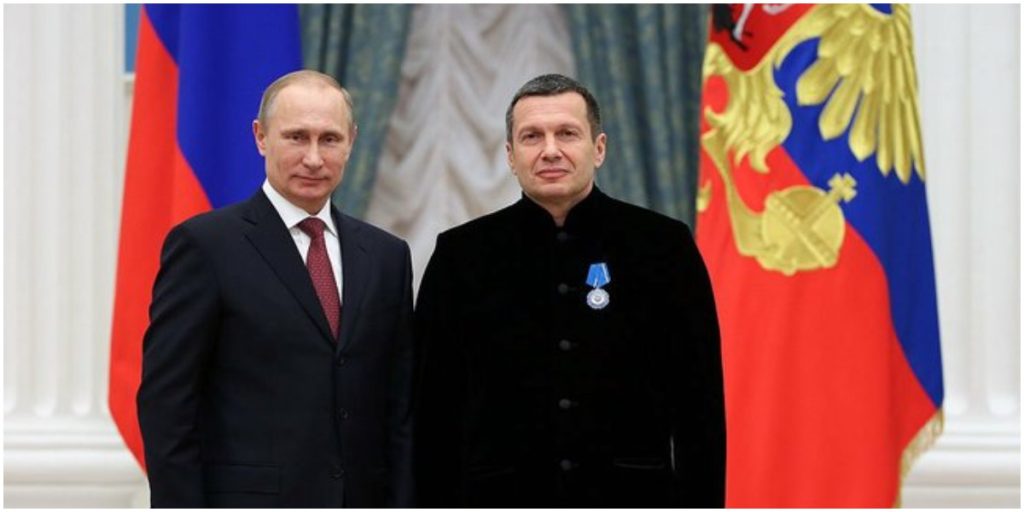 Russian President Vladimir Putin, pictured in 2013 with Vladimir Soloviev, anchor of popular Russian current affairs show, "Sunday Evening". Soloviev is an opinionated motor-mouth and as close to Putin as anyone in the media can get, writes Gwynne Dyer. Photograph courtesy of Wikimedia Commons