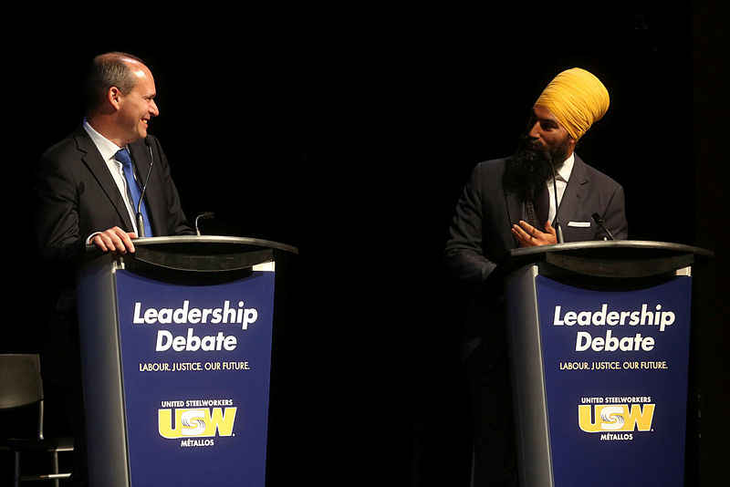 Guy Caron, left, and Jagmeet Singh have at it during an NDP leadership debate in Toronto June 22. Those two men, along with Niki Ashton, will spar again tonight in Victoria. The Hill Times photograph by Andrew Meade