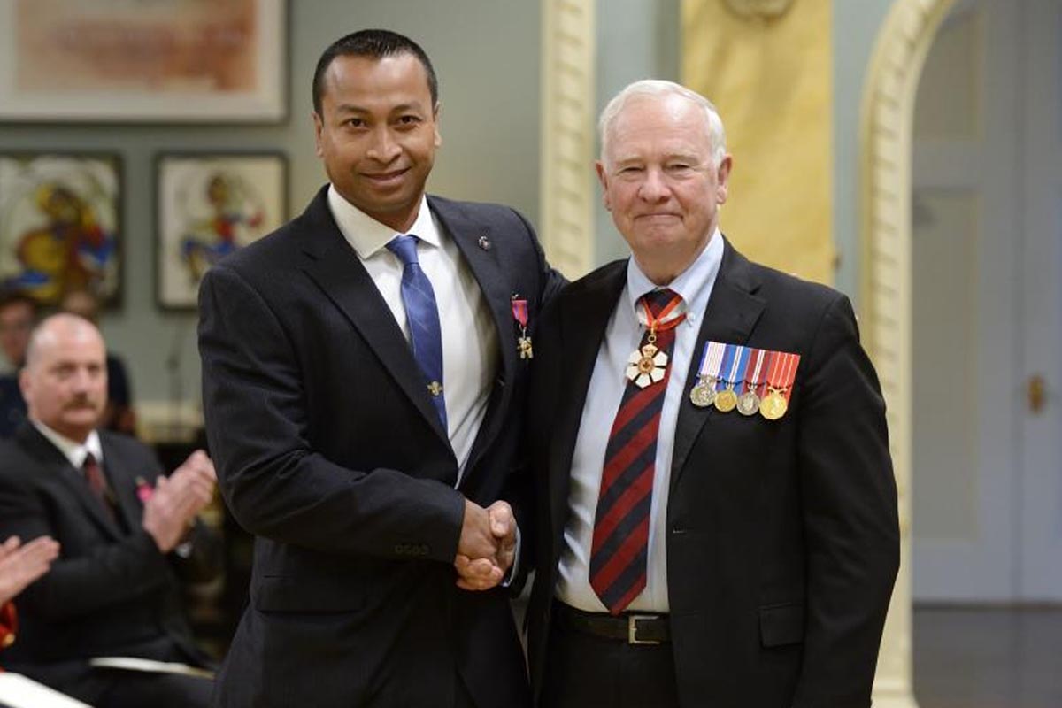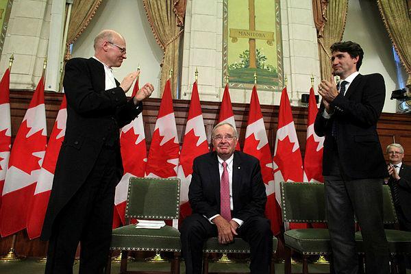 Prime Minister Justin Trudeau shakes hands with Senator Murray Sinclair