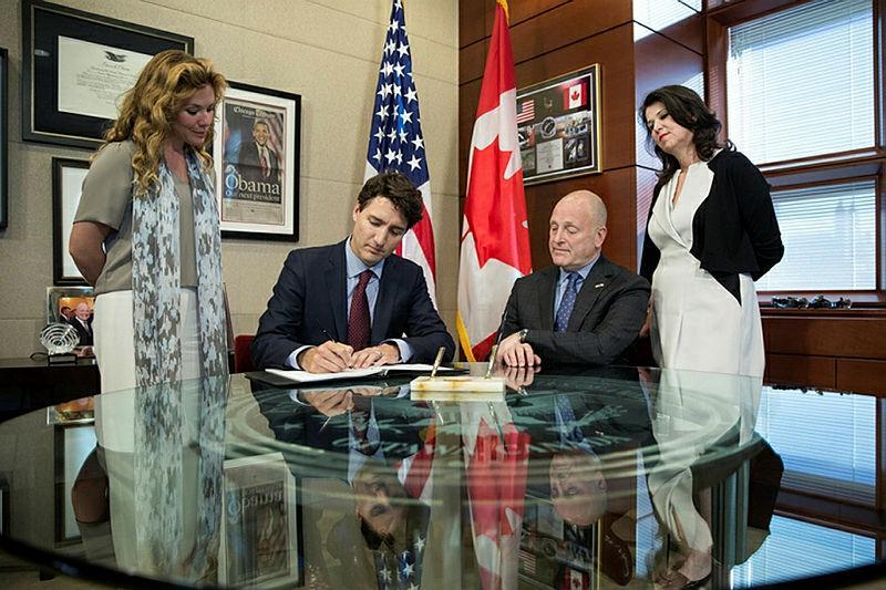 Prime Minister Justin Trudeau and his wife Sophie Grégoire Trudeau sign a book of condolences for the victims of the Orlando shooting tragedy at the United States Embassy in Ottawa. US Ambassador Bruce Heyman and his wife Vicki were present, and the group shared several rounds of embraces, according to media present at the signing. (Photograph courtesy of the PMO by Adam Scotti) Photograph courtesy of the PMO by Adam Scotti