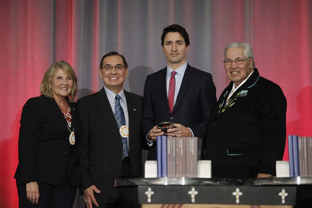 Prime Minister Justin Trudeau stands with Marie Wilson, Chief Wilton Littlechild and Justice Murray Sinclair at the December 15, 2015 release of the Truth and Reconciliation Commission final report on the Canadian residential schools. Despite Mr. Trudeau's genuine passion at the event, Jenn Jeffery's says the 2016 budget falls "far below" expectations for First Nations children. Power and Influence Photograph by Jake Wright