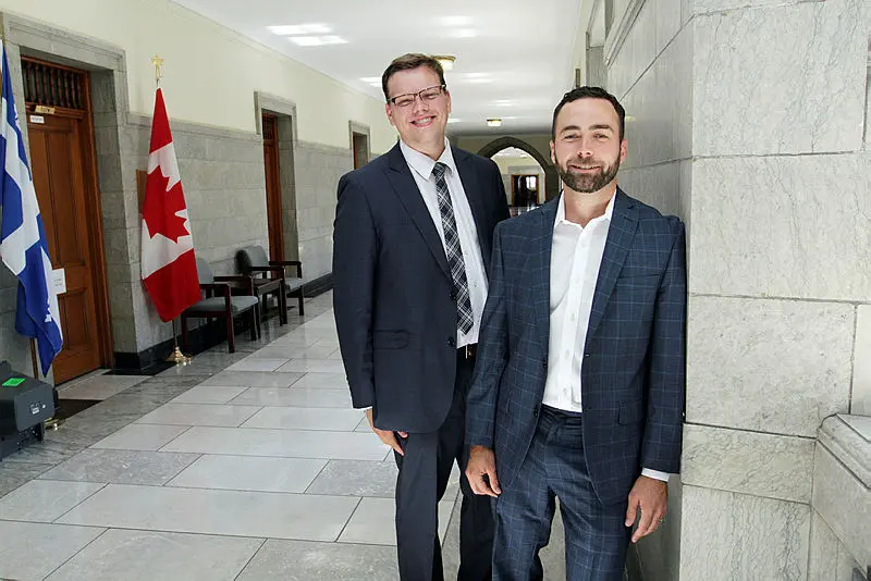 Alex Telka, left, is the 'top procedural guy' in NDP House Leader Peter Julian's office, while Jeremy Huws, right, is Mr. Julian's chief of staff. Though the party's House officers budget sank due to losses in the last election, these two staffers and several others in the party whip's office have managed to stay on, providing sought-after technical advice and analysis. The Hill Times photograph by Sam Garcia