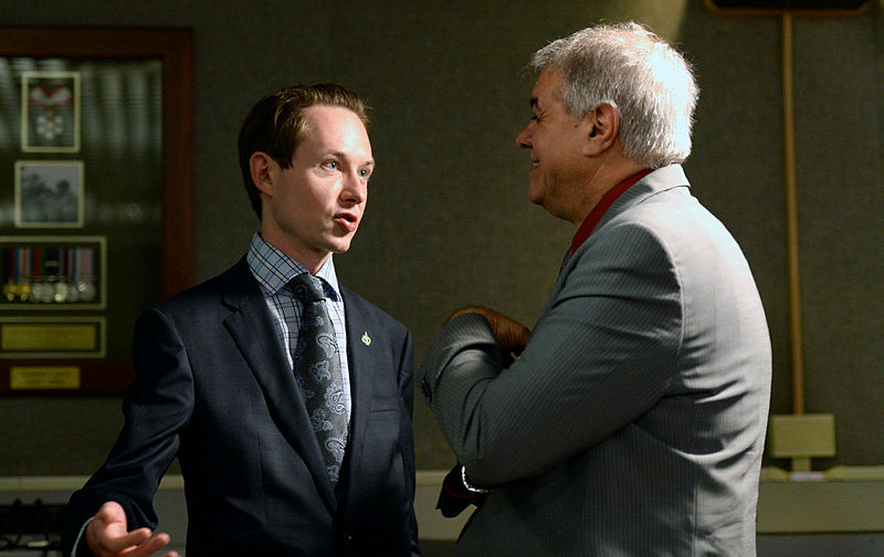 Conservative MP Michael Cooper talks with Shahram Golestaneh before a press conference on Parliament Hill last Thursday urging the federal government to disengage from Iran. Photo courtesy of Justin Tang