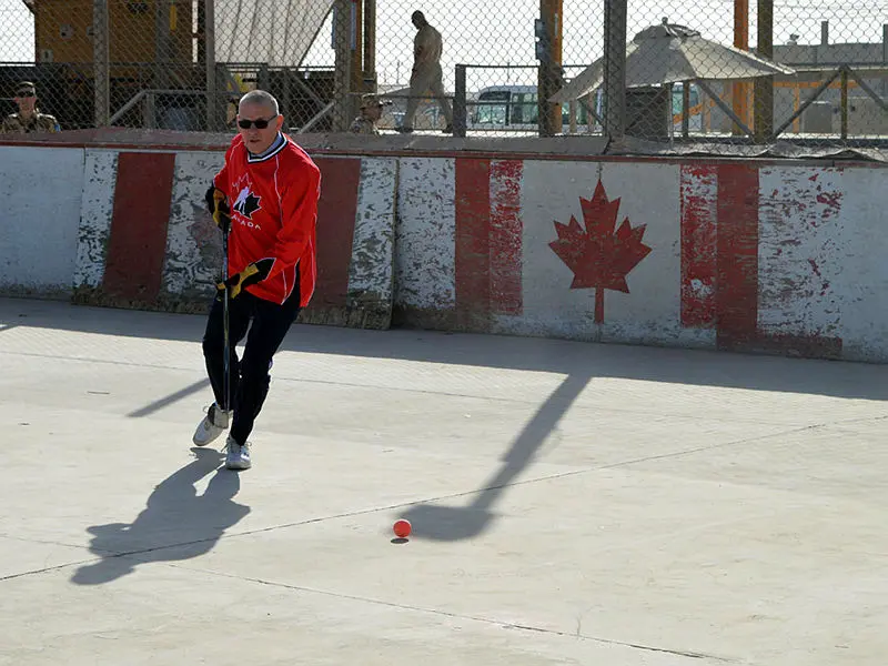 Canada's ambassador to Afghanistan, Ken Neufeld, plays one final game of ball hockey at the Canadian rink at the Kandahar Airfield on Dec. 27. Photo courtesy of Global Affairs Canada