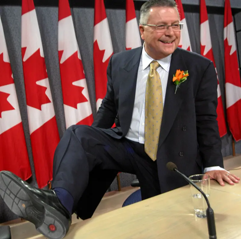Ralph Goodale, then the finance minister, shows off to journalists his new square-toed $250 Ecco shoes with polyurethane soles on Feb. 23, 2005 in the National Press Theatre in Ottawa. The Hill Times photograph by Jake Wright