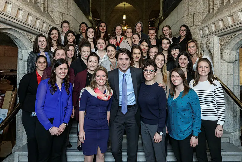 Prime Minister Justin Trudeau pictured with female staff in the Prime Minister's Office in March 2017, flanked immediately by chief of staff Katie Telford on the left and media advance Julie Tatone on the right. Photograph courtesy of the PMO