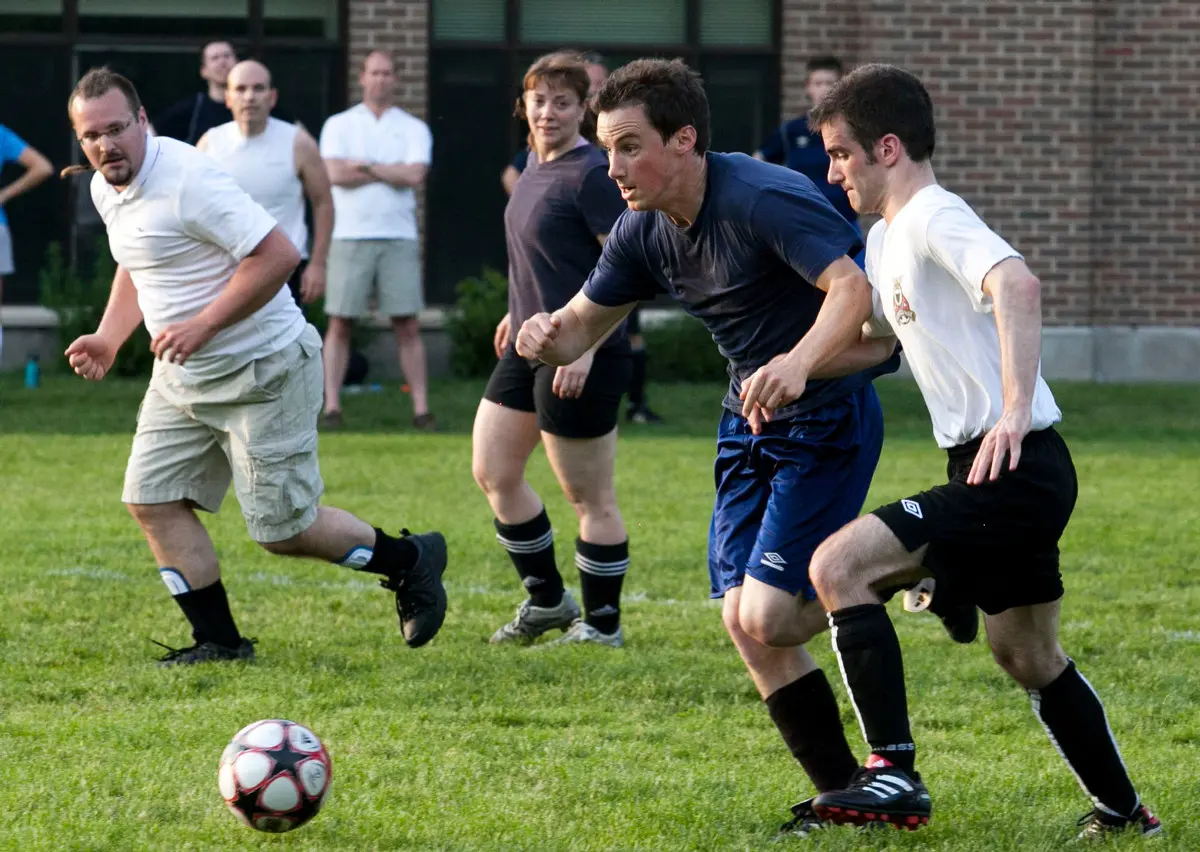 Reporters playing soccer against MPs a few years ago, including Hill Times alum Mark Burgess, centre. This year the reporters had to cancel because many of them were covering the Ontario provincial elections. The Hill Times file photograph