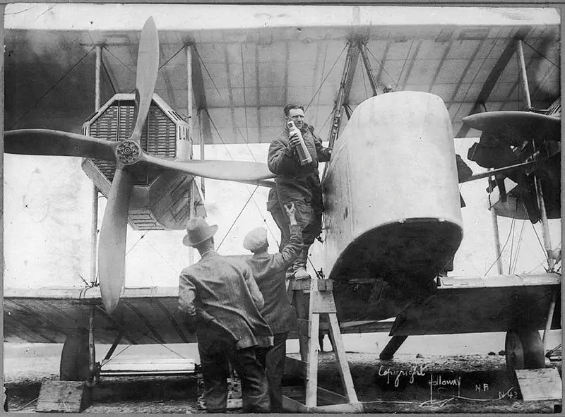 Captain John Alcock stowing provisions aboard Vickers’ ‘Vimy’ aircraft in St. John’s, N.L., before his trans-Atlantic flight with Arthur Whitten Brown on June 14, 1919. Photograph courtesy of Library and Archives Canada