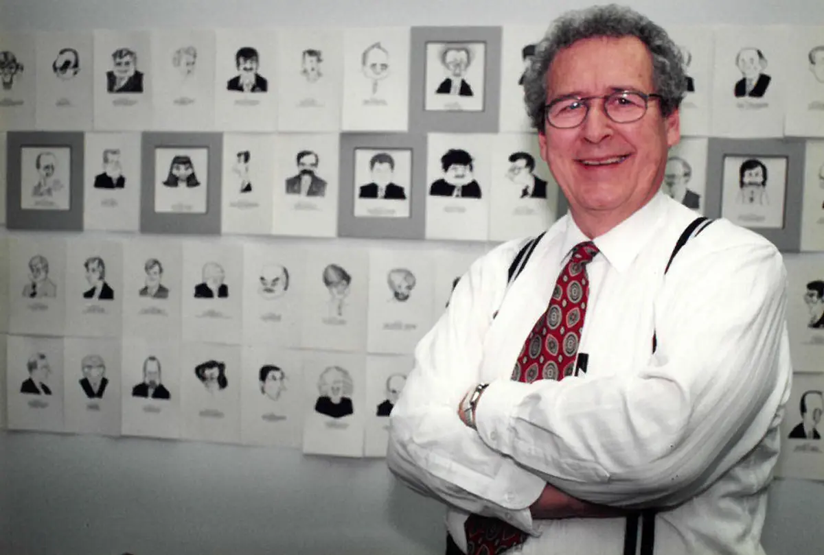 The late former Liberal MP Eugène Bellemare stands in front of a wall of caricatures he drew. He died earlier this month. The Hill Times file photograph