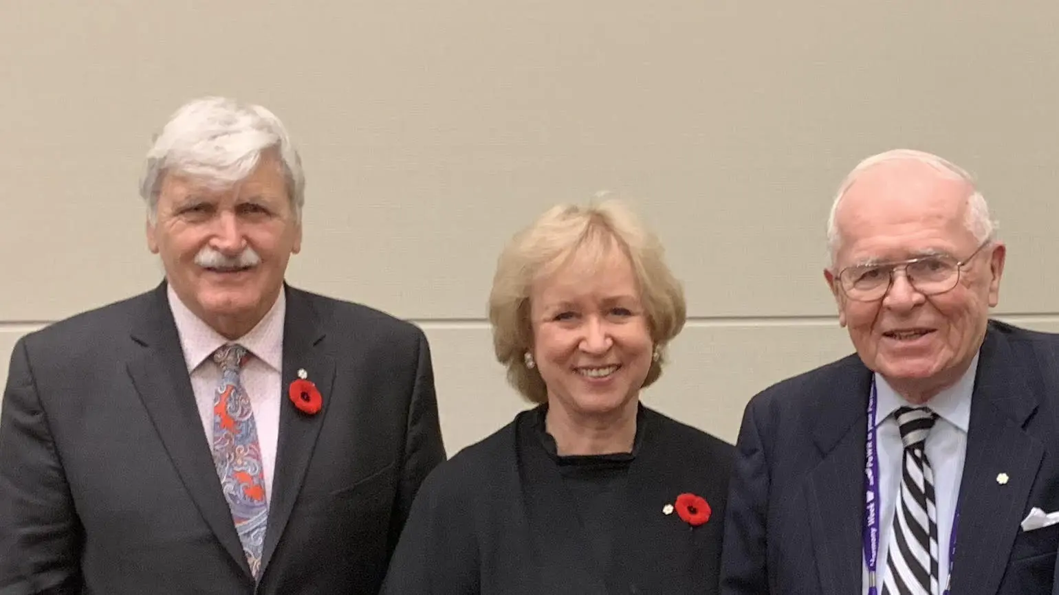 Former Liberal Senator Roméo Dallaire, former Progressive Conservative prime minister Kim Campbell, and former PC MP and Independent Senator Douglas Roche pose together at the Parliament of the World’s Religions event earlier this month in Toronto. Photograph courtesy of Douglas Roche