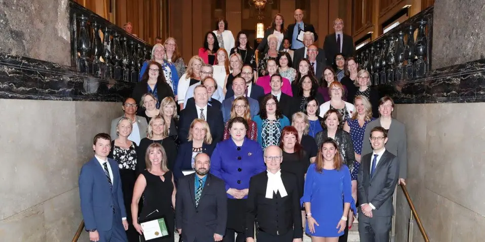 House of Commons Speaker Geoff Regan, pictured bottom centre, alongside a number of the Hill staffers who were honoured with long service awards at a ceremony in the Sir John A. Macdonald building on May 28. Photograph courtesy of the House of Commons