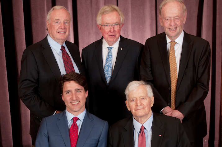 The Prime Ministers' Club: Prime Minister Justin Trudeau, front left, with John Turner, right; former Liberal prime minister Paul Martin, rear left, former Progressive Conservative prime minister Joe Clark, centre, and former Liberal prime minister Jean Chrétien. The Hill Times photograph by Jean-Marc Carisse
