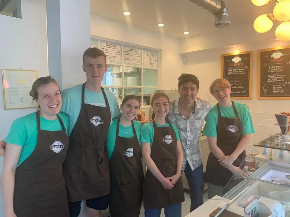 Julia Stothart, left, Sander Van Walraven, Gabby Yendall, Nadia Etzinger, Prime Minister Justin Trudeau, and Billie Desrochers, pictured on June 30, at the Merry Dairy in Ottawa's Hintonburg neighbourhood. Photograph courtesy of Marlene Haley
