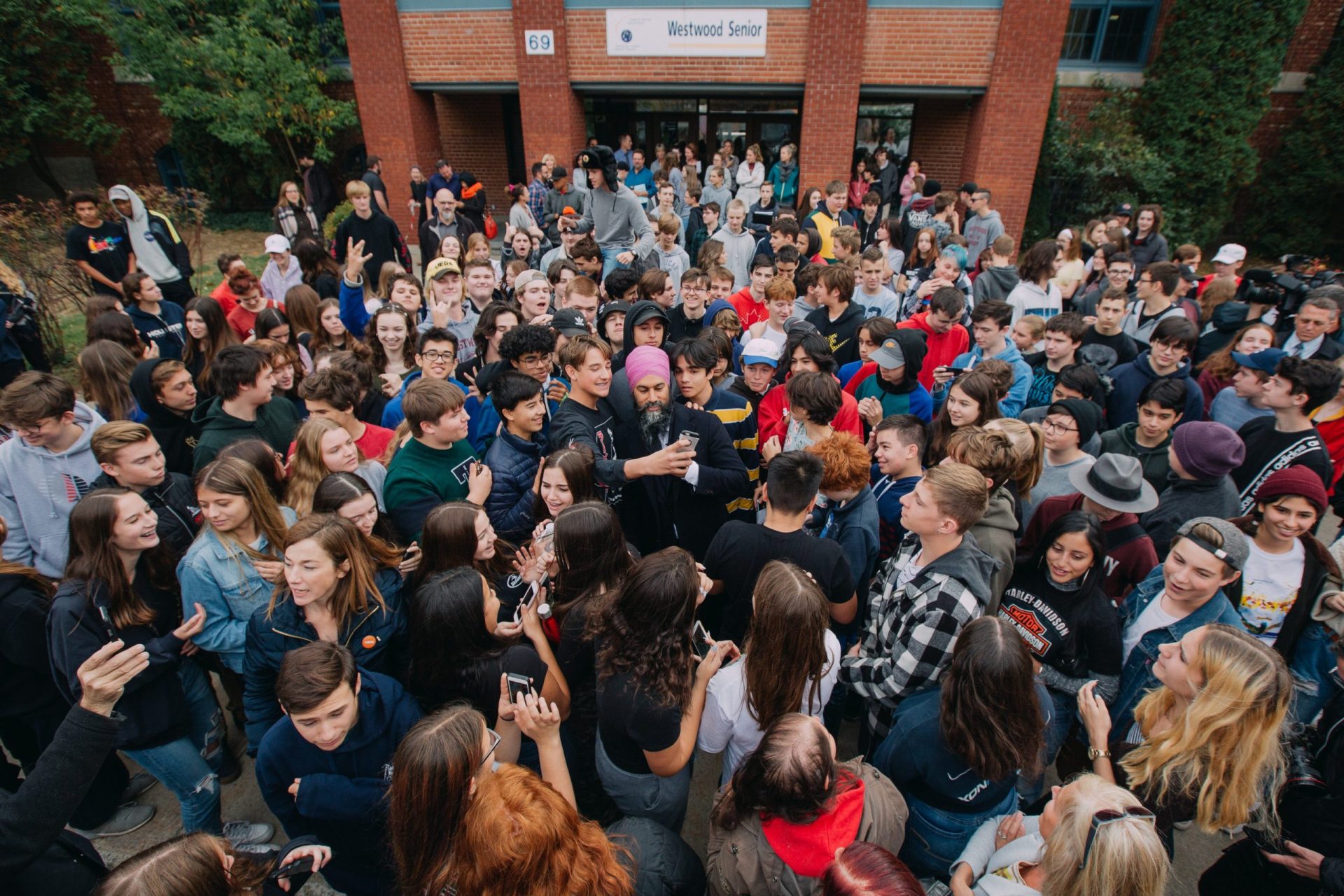 NDP Leader Jagmeet Singh visited former NDP leader Jack Layton's high school, Westwood Senior High School, in Hudson, Que., on Oct. 16. Photograph courtesy of Jagmeet Singh's Twitter