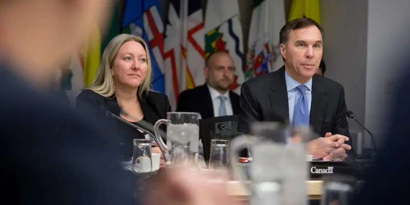 Finance Minister Bill Morneau, right, and Associate Finance Minister Mona Fortier are pictured on Dec. 17 during a meeting with provincial finance ministers in Ottawa. With the 2020 budget on the horizon, Mr. Morneau has made strides in getting his team in place post-election. The Hill Times photograph by Andrew Meade