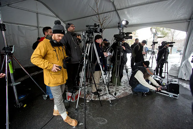Parliament Hill media, pictured on March 17, 2020, outside Rideau Cottage where Prime Minister Justin Trudeau has been holding his daily press briefings since he's been in self-isolation since March 12. The Hill Times photograph by Andrew Meade