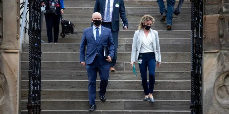 Conservative Leader Erin O'Toole, pictured Sept. 9, 2020, with his chief of staff, Tausha Michaud, on their way to his first caucus meeting as leader. The Hill Times photograph by Andrew Meade