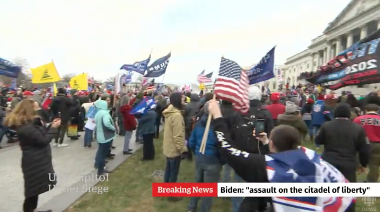 A mob of Trump loyalists stormed and breached the U.S. Capitol on Jan. 6, 2021, as Congressional leaders convened to certify the victory of Joe Biden as the next U.S. president. Screen capture via CBC News