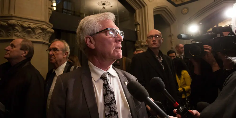 Minister Jim Carr, the PM's Special Representative for the Prairies, is pictured speaking to reporters in the West Block back in April 2019, with Jeff Kovalik-Plouffe pictured to his right. The Hill Times photograph by Andrew Meade