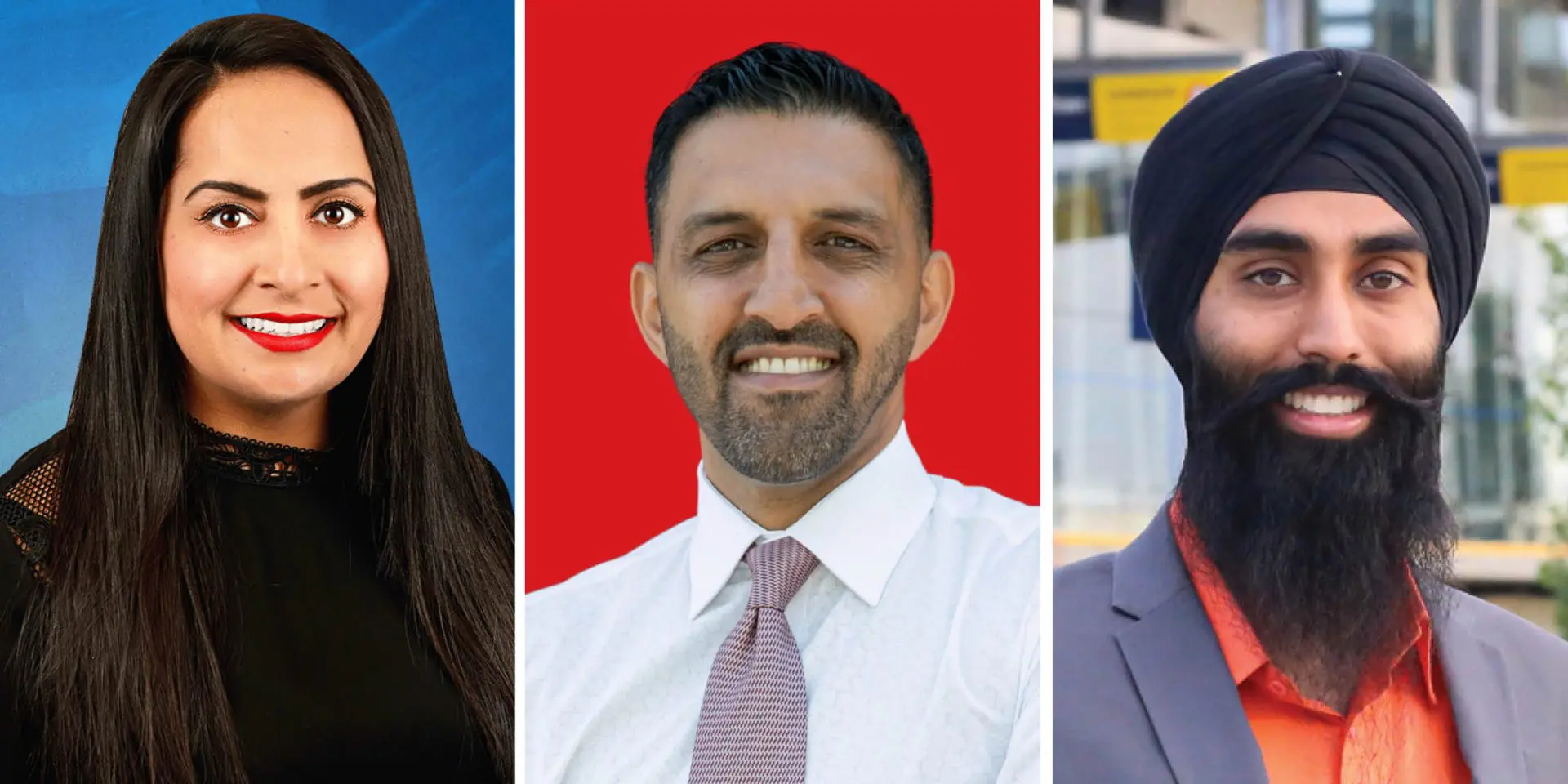 Calgary Skyview Conservative incumbent Jag Sahota, left, is facing a tough challenge from Liberal George Chahal, centre. Gurinder Gill is the NDP candidate in the riding. Photographs courtesy of twitter and NDP.ca