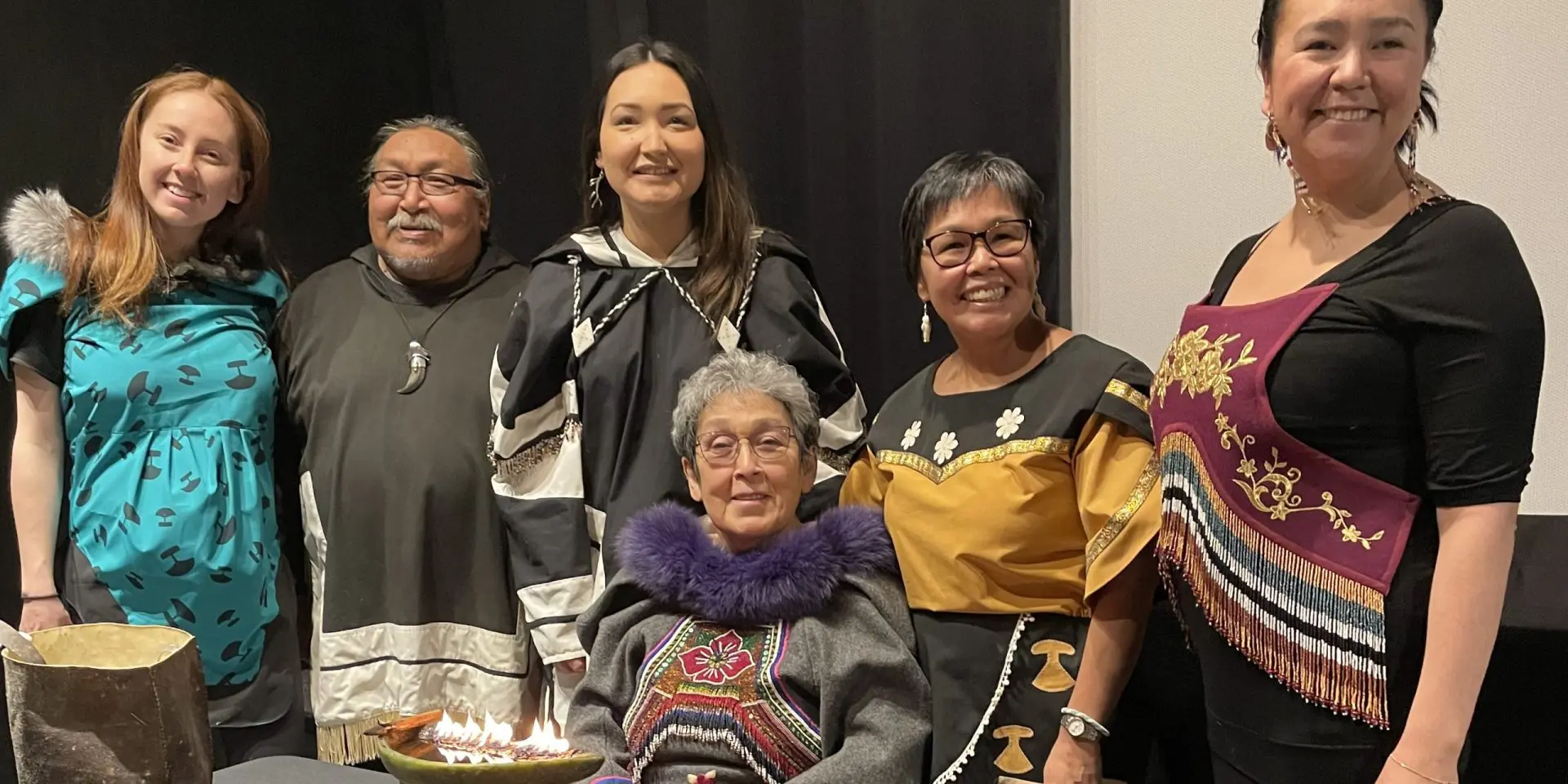 NDP MP Lori Idlout, second from right, was sworn in at a virtual ceremony at the Astro Movie Theatre in Iqaluit, Nunavut, on Nov. 12. Ms. Idlout took the oath in Inuktitut, and was joined by a number of traditional Inuit performers including, from left to right, Alexia Alainga (throatsinger), Mathew Nuqinga (drum dancer), Kristen Kownak (throatsinger), Elisapi Aningmiuq (Qulliq lighting), and Elisapee Tatigat Avingaq (singer). Photograph courtesy of Lori Idlout