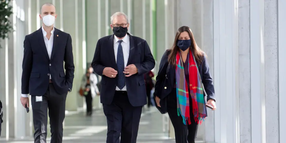 Veterans Affairs Minister Lawrence MacAulay is pictured leaving a Liberal cabinet meeting at 111 Sussex Drive on Oct. 27, 2021, flanked by his chief of staff, Patricia Beh, and his now-former press secretary, Cameron McNeill, left. The Hill Times photograph by Andrew Meade