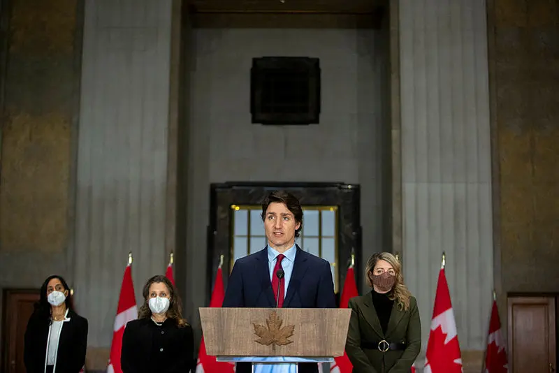 Prime Minister Justin Trudeau, pictured Feb. 24, along with Defence Minister Anita Anand, Deputy Prime Minister Chrystia Freeland, and Foreign Affairs Minister Mélanie Joly, reacting to Russia’s invasion of Ukraine. It is time for the U.S. and Russia to return to the bargaining table and negotiate another type of Intermediate Nuclear Forces Treaty, writes Erika Simpson, and in the aftermath, Canada should have no hesitation in helping the European allies build up their conventional forces, but not their nuclear forces. The Hill Times photograph by Andrew Meade