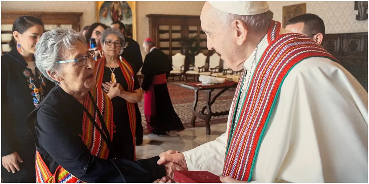 Elder Angie Crerar shakes hands with Pope Francis inside the Vatican chambers following a private meeting on March 28. Behind Crerar stand Cassidy Caron, president of the Métis National Council and Elder Angie LaFleur. Matt LeMay photograph courtesy of Métis National Council