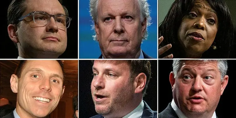 The candidates in the Conservative leadership race are, clockwise from top left, Pierre Poilievre, Jean Charest, Leslyn Lewis, Scott Aitchison, Roman Baber, and Patrick Brown. The Hill Times photographs by Andrew Meade, Sam Garcia and Jake Wright