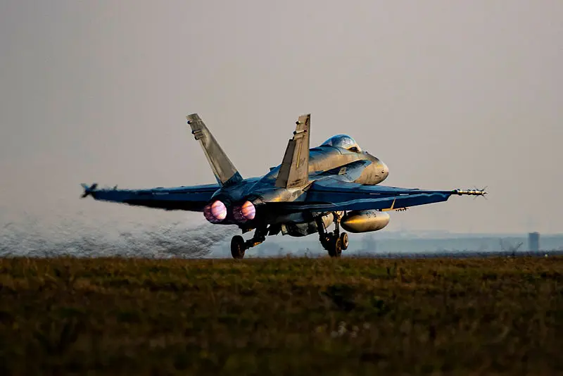A Royal Canadian Air Force CF-188 Hornet takes off from Mihail Kogalniceanu Air Base during Operation REASSURANCE Air Task Force - Romania on November 19, 2021. Photograph courtesy of Aviator Avery Philpott, Canadian Armed Forces photo
