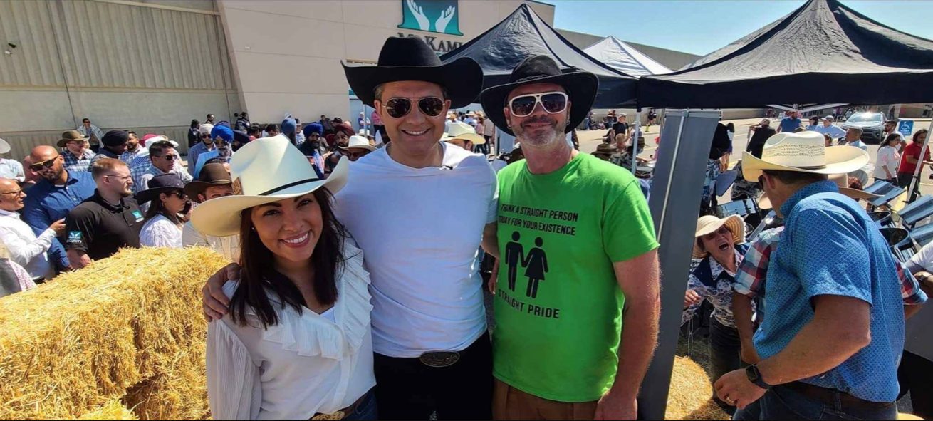 Conservative Leader Pierre Poilievre, centre and his wife Anaida, left, pose with a man wearing a 'straight pride' T-shirt during a Calgary Stampede event. Photograph courtesy of @BSpence1983/Twitter