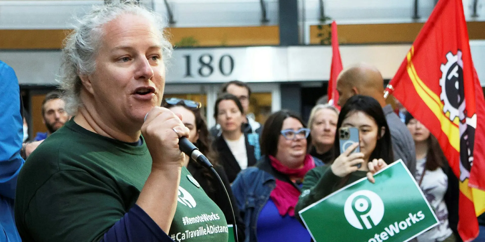 Jennifer Carr, president of PIPSC, pictured Sept. 9, 2024, at a rally for public servants' remote work rights outside 365 Laurier Avenue West in Ottawa, Immigration and Citizenship Canada. The Hill Times photograph by Sam Garcia