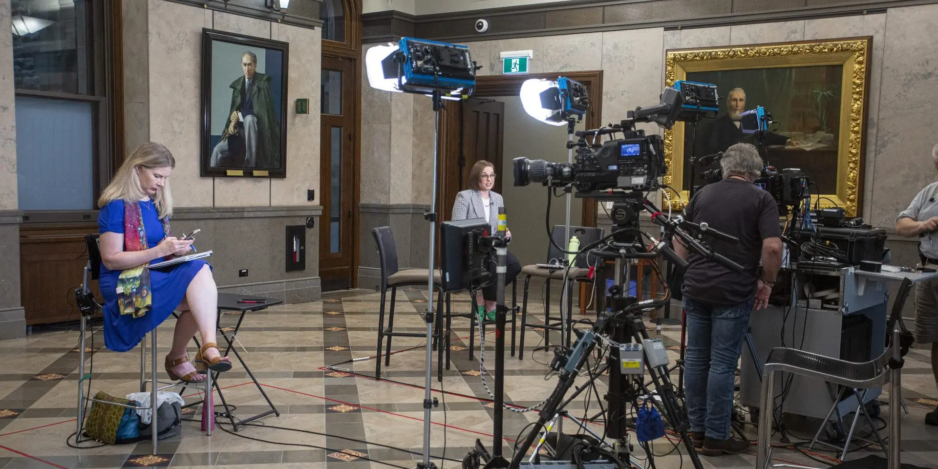 CBC’s Janyce McGregor and CTV’s Rachel Aiello get ready for live hits from the House of Commons foyer on Sept. 16 as Parliament returns for the fall session. The Hill Times photograph by Andrew Meade
