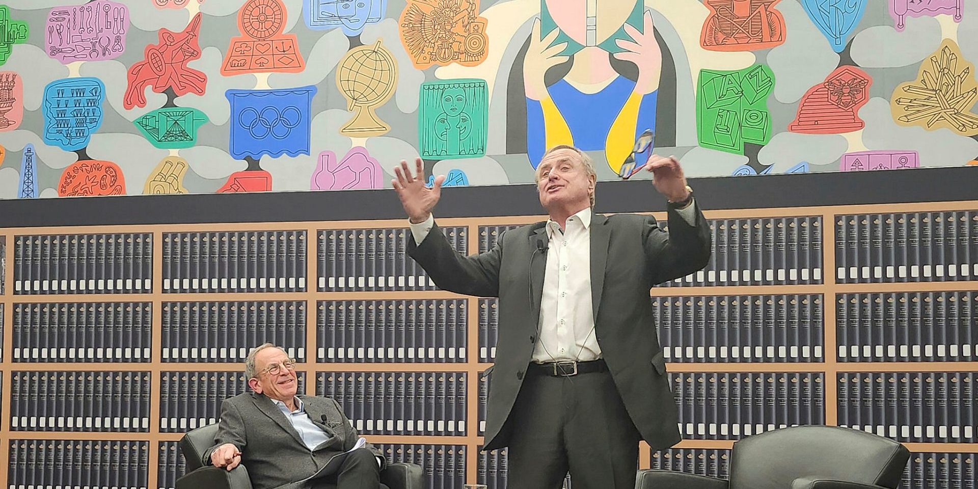 Andrew Cohen, left, watches Sergio Marchi get animated at his book launch at the Library and Archives on Nov. 18 in Ottawa. Marchi will host another book launch on Dec. 2 at The Met in Ottawa. The Hill Times photograph by Tessie Sanci
