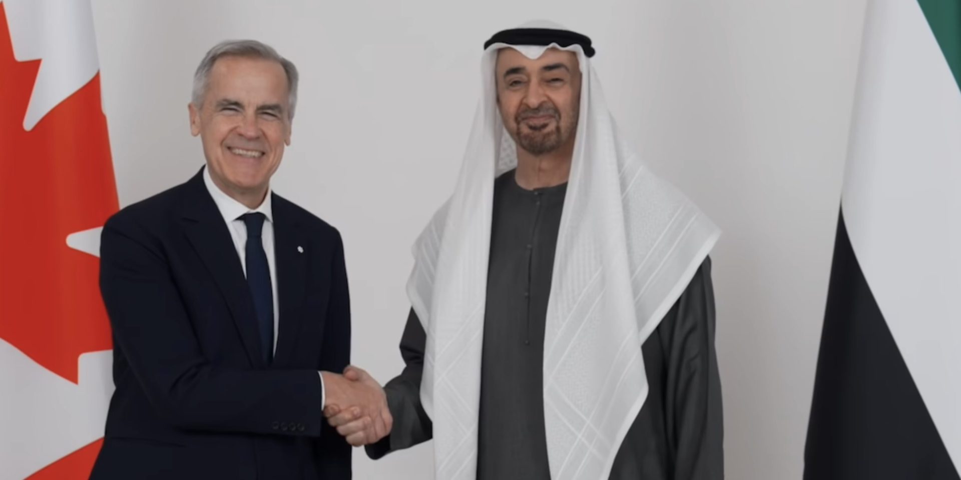 Prime Minister Mark Carney, left, returned home with a $70-billion investment commitment after meeting with United Arab Emirates President Mohammed bin Zayed Al Nahyan last month. Screenshot courtesy of LinkedIn