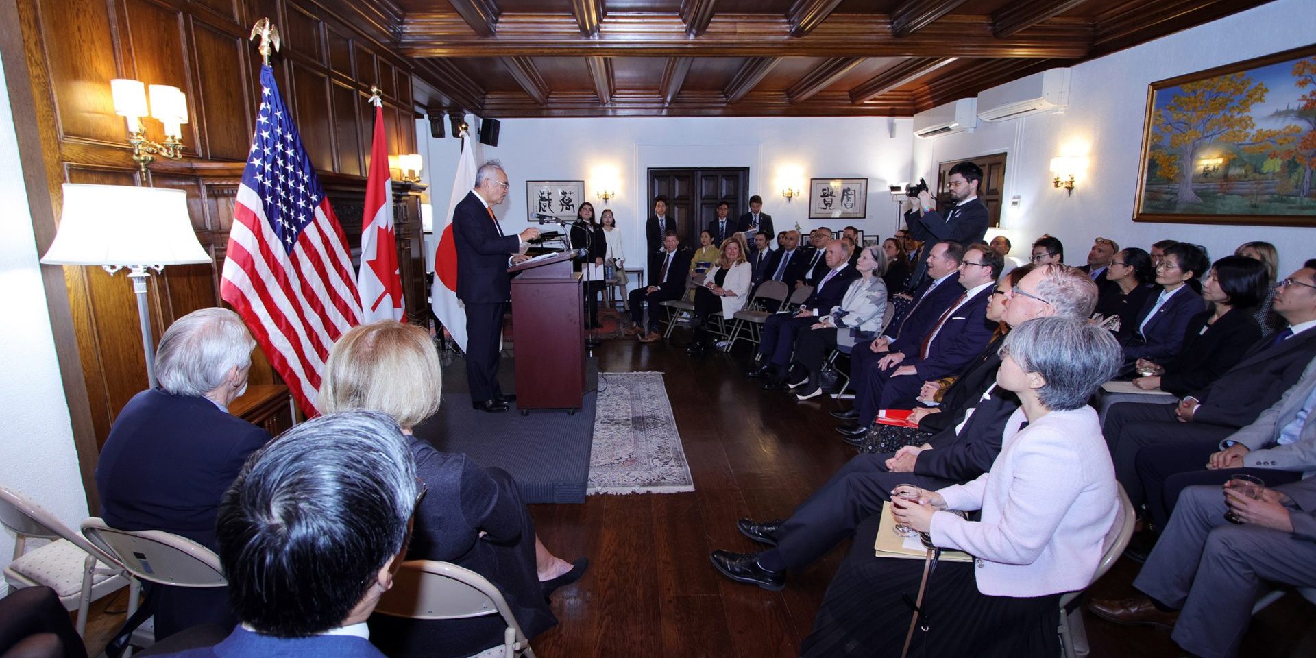 Japanese Ambassador Kanji Yamanouchi addresses guest gathered for a reception following the Japan-Canada-U.S. Partnership Through Culture and Diplomacy panel discussion at the official residence on Oct. 23. The Hill Times photograph by Sam Garcia